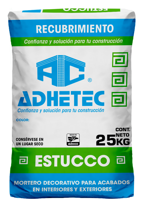 El ESTUCCO ADHETEC es un texturizado en polvo, elaborado a base de cemento, fibras, aditivos químicos y agregados minerales con una granulometría muy controlada que al mezclarse con agua, se forma una pasta fácil de aplicar con la cual se puede lograr acabados en interiores y exteriores .