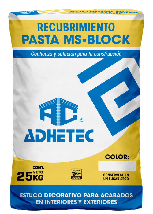 La PASTA MS-BLOCK DE COLOR ADHETEC, se emplea para colocar acabados finales sobre muros sin necesidad de pintura, se puede utilizar tanto en interiores como exteriores.
