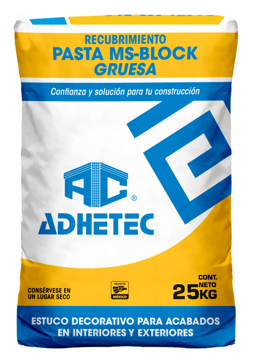 La PASTA MS-BLOCK GRUESA ADHETEC, es un texturizado en polvo con granulometría gruesa y se emplea para colocar acabados finales (rústicos) sobre muros. Se puede utilizar tanto en interiores como exteriores.