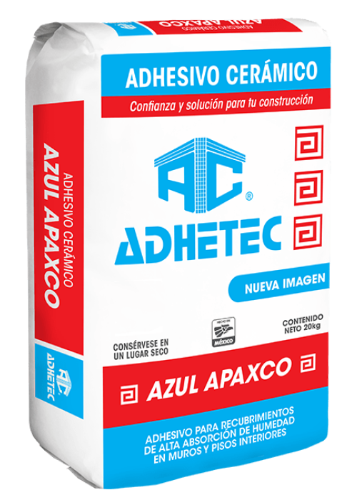 El pegazulejo AZUL APAXCO ADHETEC es un mortero de color gris con granulometría controlada de tamaño medio y aditivos especiales que brindan una gran adhesividad, retención de agua y facilidad de aplicación. Su demanda de agua es de 4 a 4.5 litros por cada 20 kg.