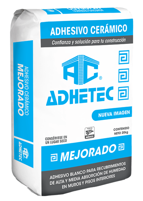 El pegazulejo Mejorado ADHETEC es un mortero con granulometría controlada de tamaño medio y aditivos especiales que brindan una gran adhesividad, retención de agua y facilidad de aplicación. Su demanda de agua es de 4.5 a 5 litros por cada 20 kg.