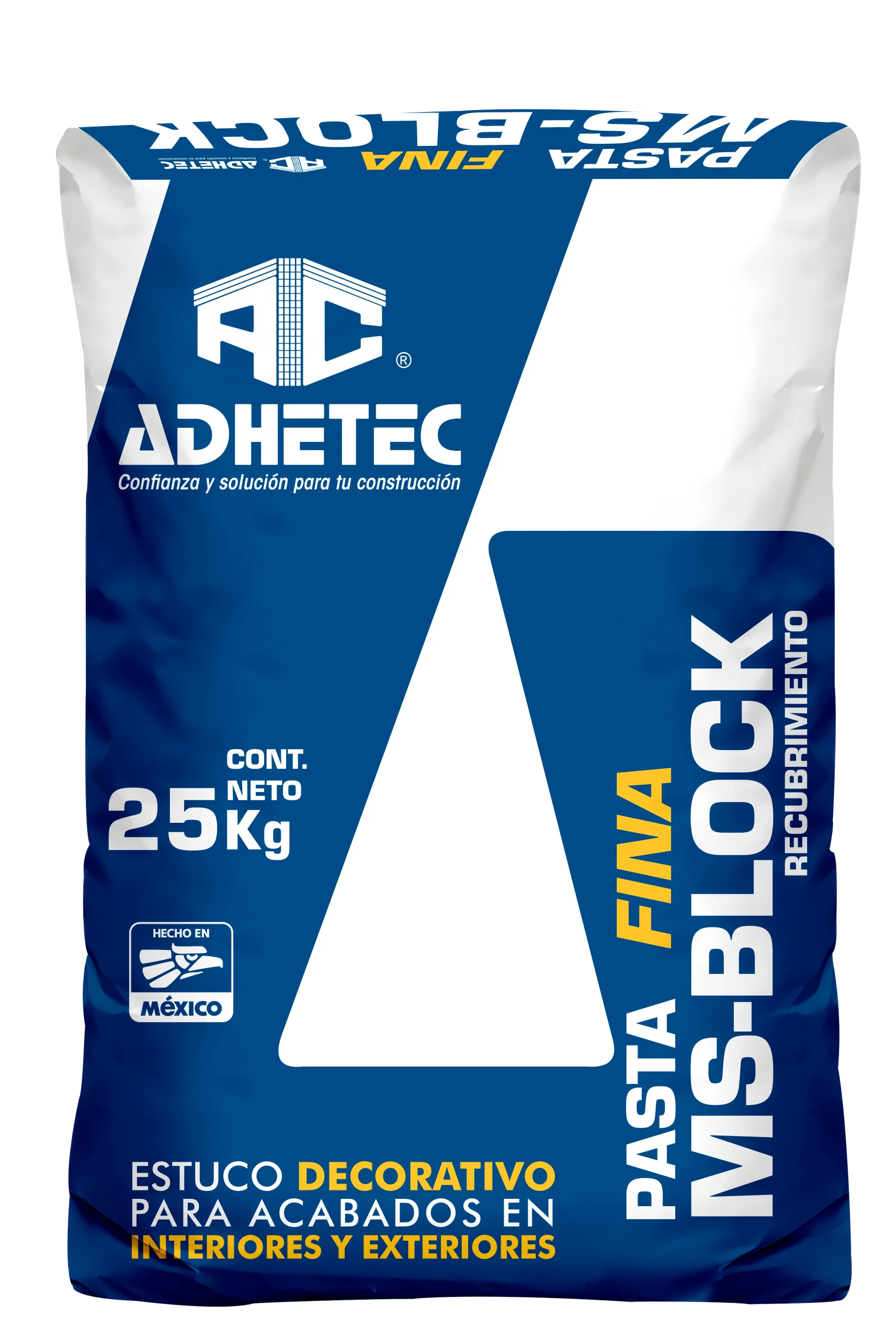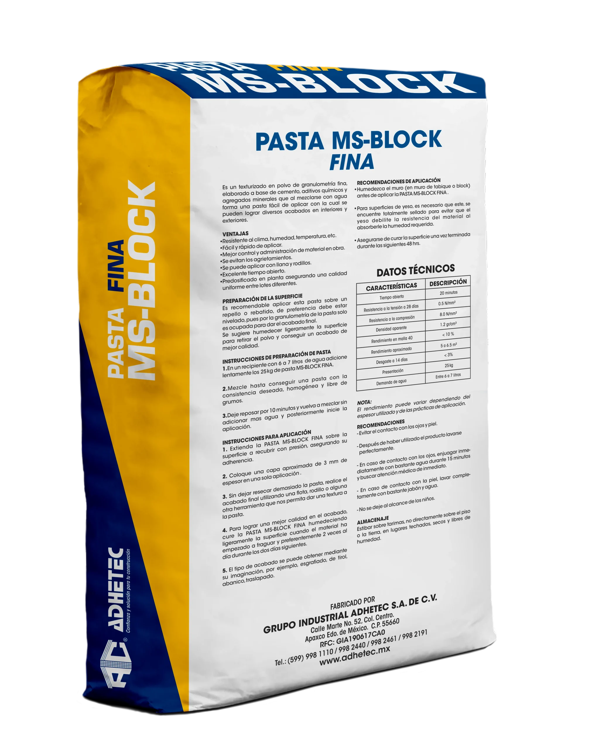 La PASTA MS-BLOCK FINA ADHETEC es un texturizado en polvo de granulometría fina, elaborado a base de cemento, aditivos químicos y agregados minerales con una granulometría que al mezclarse con agua forma una pasta fácil de aplicar con la cual se puede lograr acabados en interiores y exteriores.